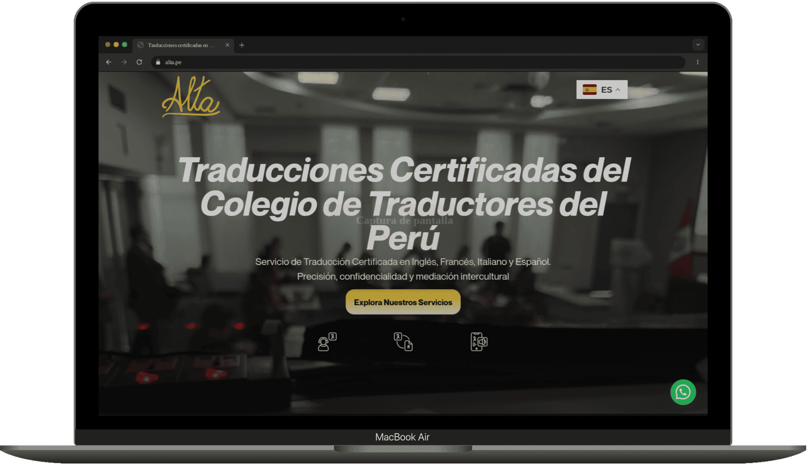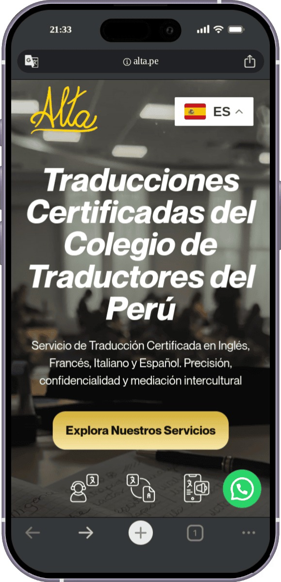 La cliente, Liliana S., necesitaba establecer la presencia digital para "ALTA", su negocio especializado en servicios de traducción e interpretación, bajo el dominio alta.pe. El reto consistía en crear un diseño simple pero muy llamativo, con colores vibrantes que resaltaran visualmente. Además, requería una estructura tipo Landing Page muy directa (con secciones de Inicio, Servicios, Galería de fotos y Testimonios) y pidió estrictamente no incluir formularios de contacto tradicionales, dependiendo únicamente de un botón de WhatsApp para la interacción con los clientes.